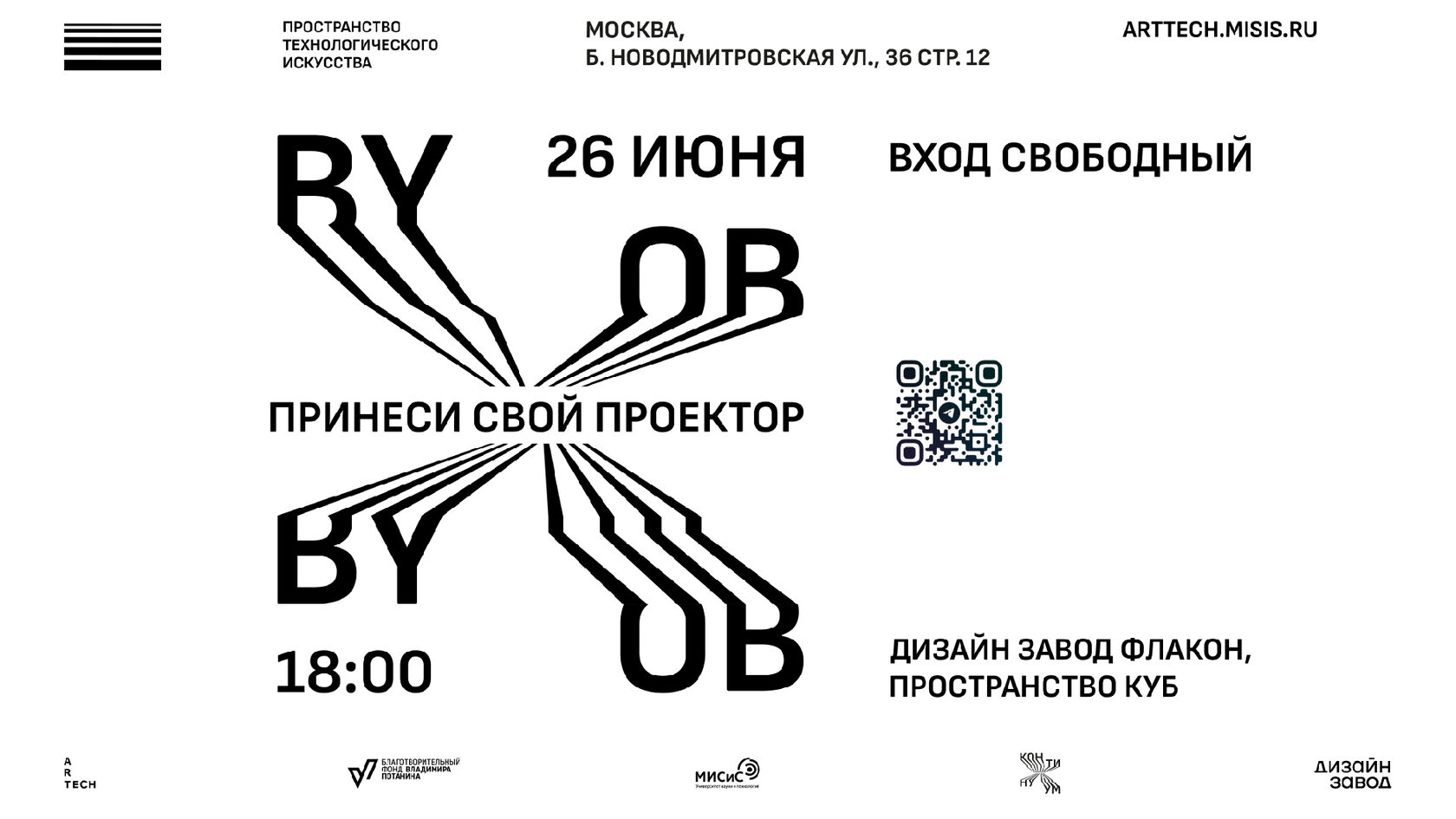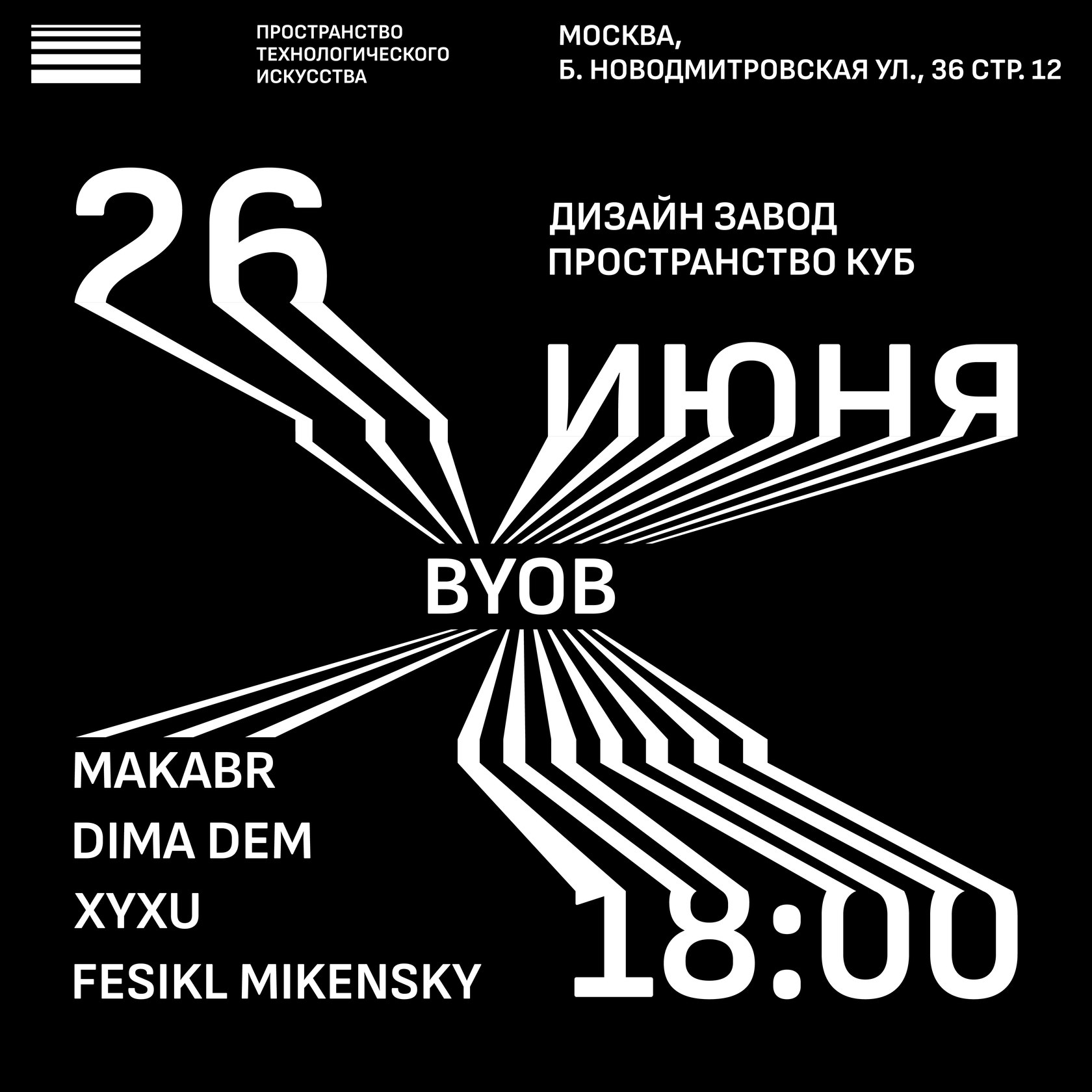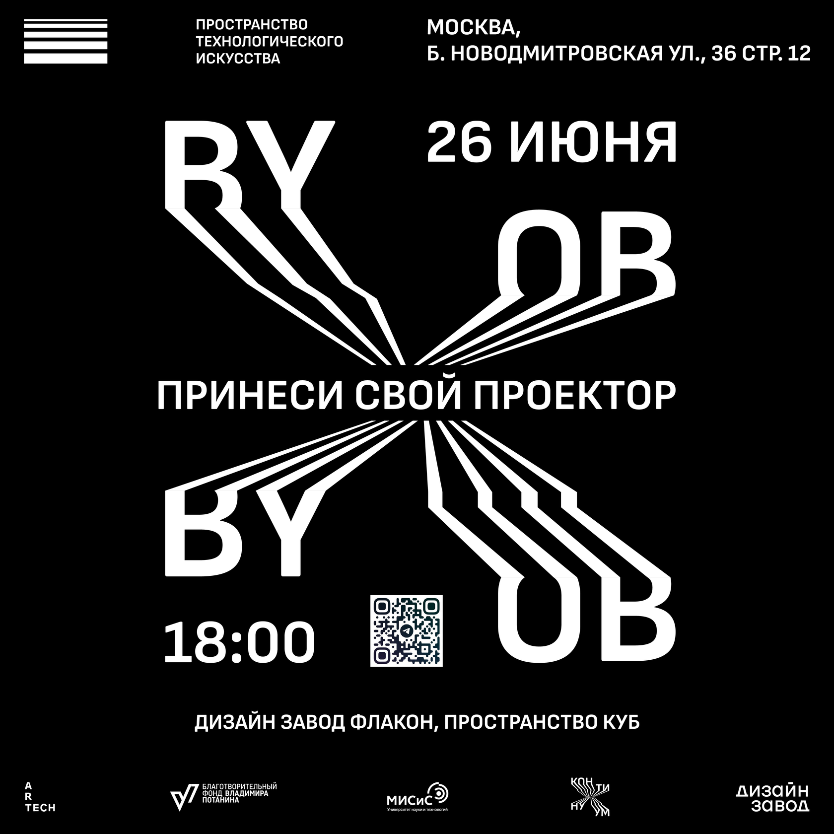 BYOB stands for Bring Your Own Beamer – Bring your projector. The initiative of such an event is aimed at establishing connections within and outside the creative community of technological artists: those who work with 3D graphics, generative graphics, coding and video art. Anyone could come and plug their projector into a free outlet to show their work.