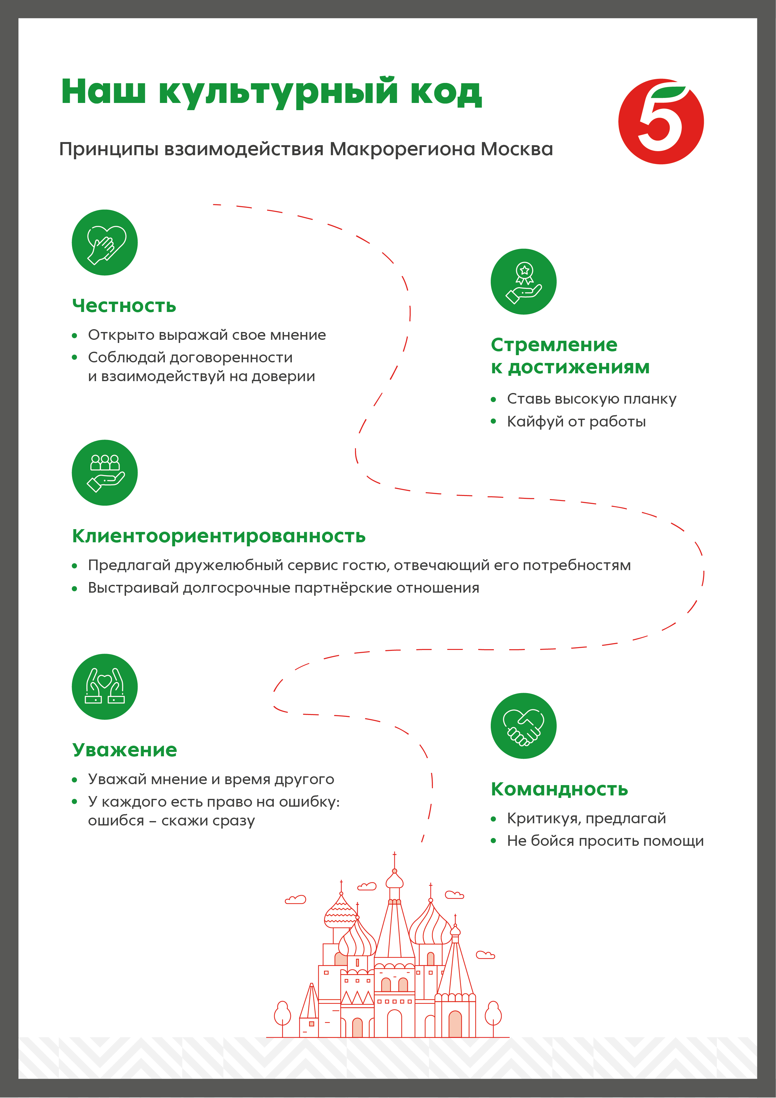 Structuring information about the principles of work in the Moscow macro-region, emphasizing values and explaining them in a soft way. A leaflet for office employees. The leaflet is not overloaded with text and graphic elements.
