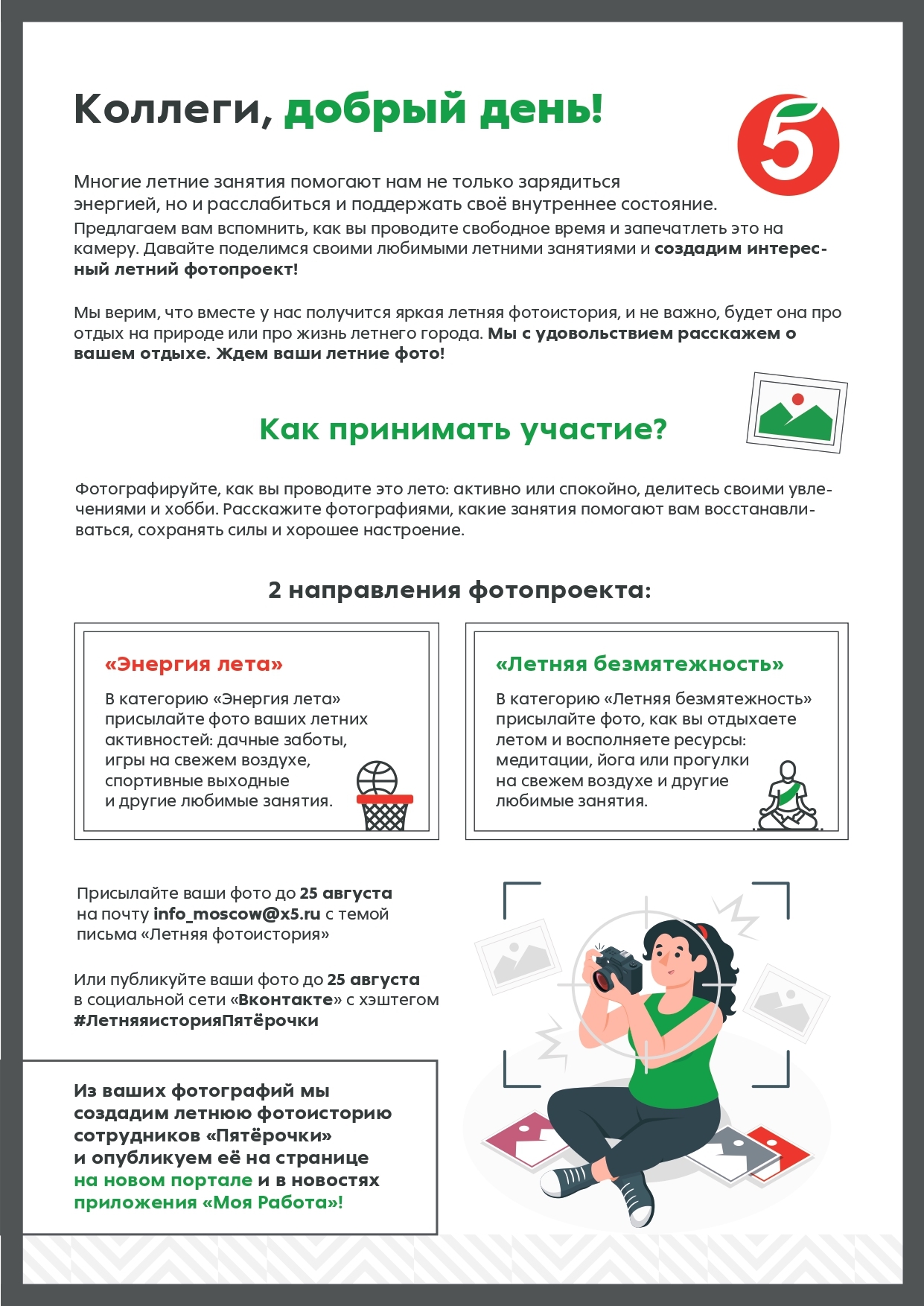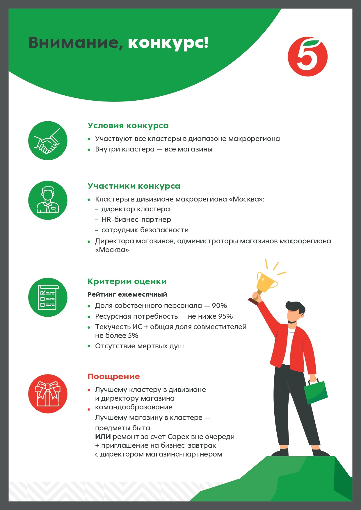 A leaflet to inform about the start of the competition for employees of "Пятёрочка" stores. The terms of the competition are simple and clear, written clearly and structured. The design of the leaflet attracts attention and engages in participation.